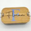 Brotdose personalisiert aus Edelstahl mit Bambus Deckel "Buchstabe blau"