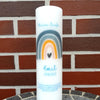 Taufkerze personalisiert mit Namen Datum und Taufspruch "Regenbogen blau/grau/Schrift blau", Junge/ Mädchen