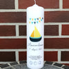 Taufkerze personalisiert mit Namen Datum und Taufspruch "Boot Wimpelkette petrol", Junge/ Mädchen