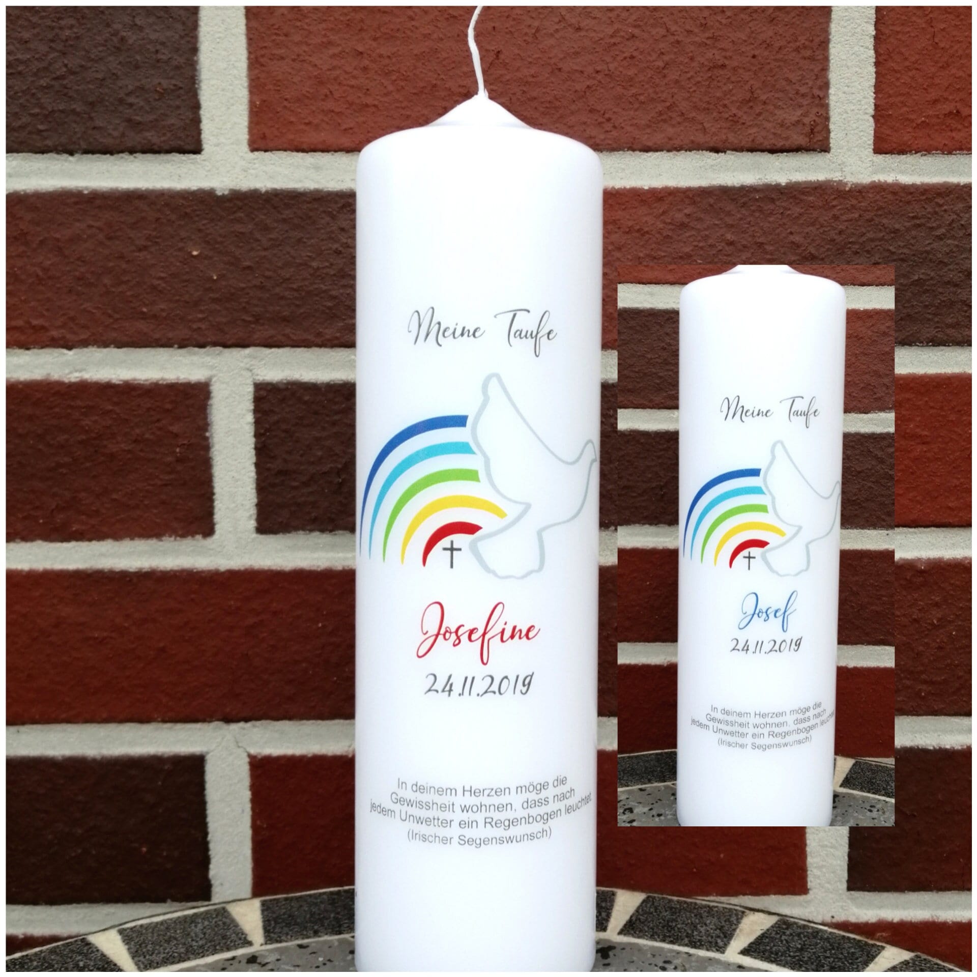 Taufkerze personalisiert mit Namen Datum und Taufspruch "Regenbogen Taube", Junge/ Mädchen