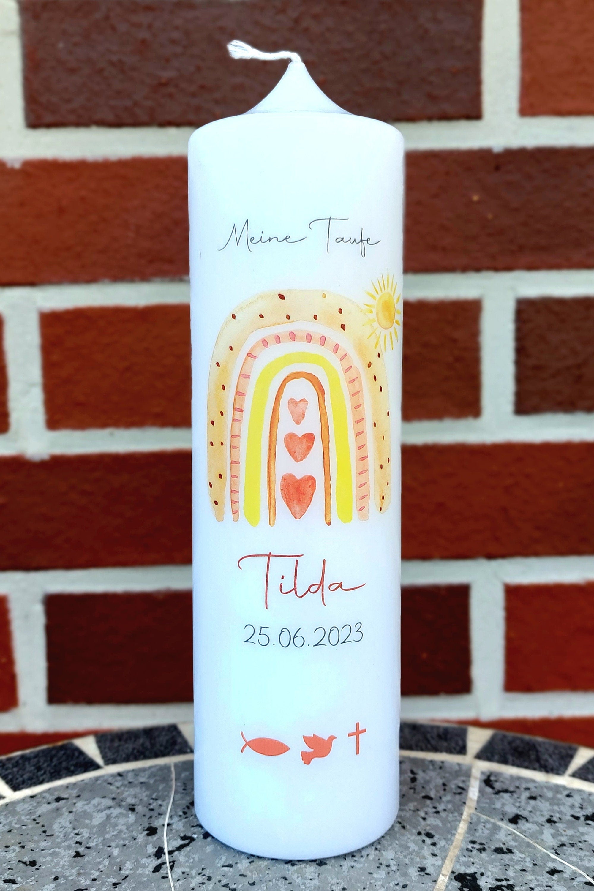 Taufkerze personalisiert mit Namen Datum und Taufspruch "Regenbogen gelb Sonne", Junge/ Mädchen