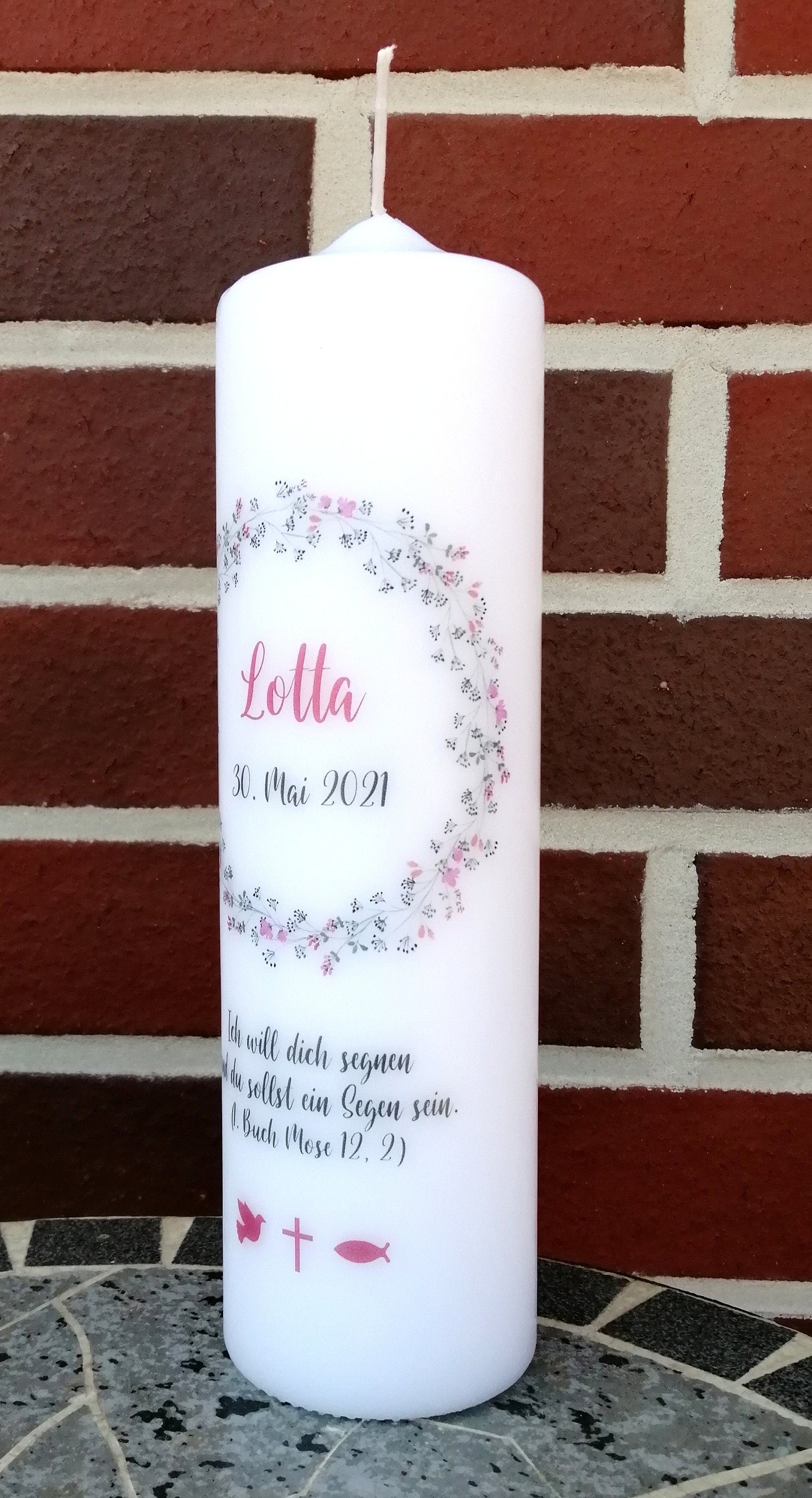Taufkerze personalisiert mit Namen Datum und Taufspruch "Blumenkranz 7", Junge/ Mädchen