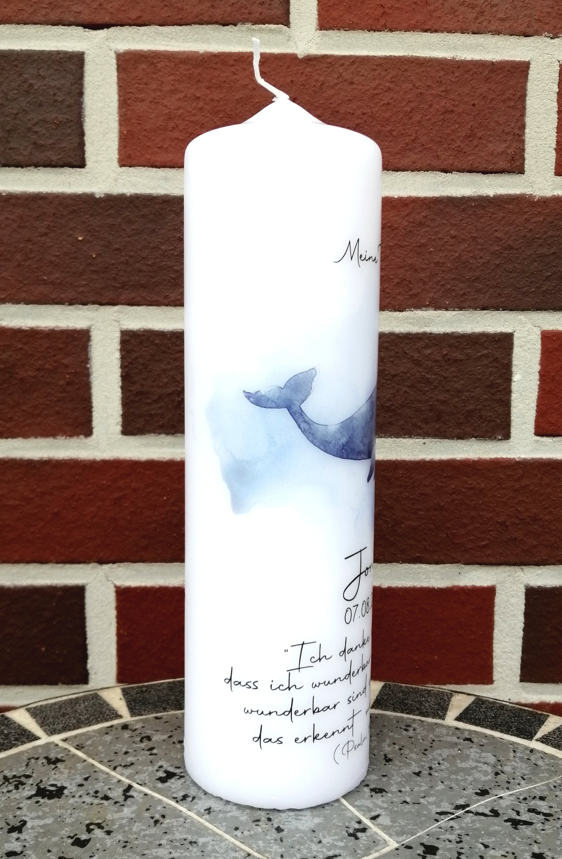 Taufkerze personalisiert mit Namen und Datum "Wal u. Taufspruch", Junge/ Mädchen